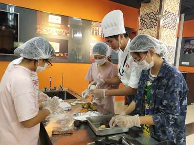 中秋佳节来临之际,我校第二期后勤烹饪班在温馨欢快的氛围中拉开了帷幕。9月19日下午,20余位师生学员在营养实训室聚集一堂,后勤保障处特邀上海新伍餐饮服务有限公司的粤式点心师,指导学员们亲手制作“私人订制”的特色月饼。来自世界各地、五湖四海的师生们齐聚一堂,欢声笑语,在这个寓教于乐的课堂中,从称料、揉皮、捏合、压模,每一步都考验着学员们的手艺和耐心,在制作的过程中,学员们不仅感受到了浓浓的中秋佳节氛围,更体会到了自己亲手制作月饼的幸福快乐。