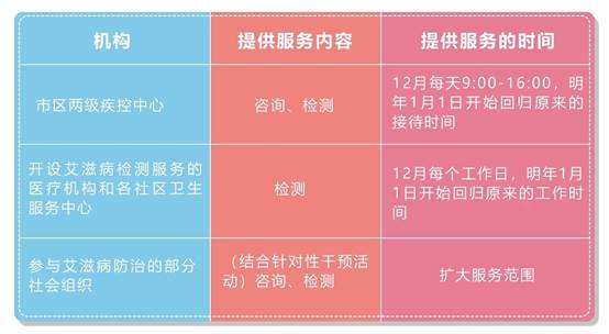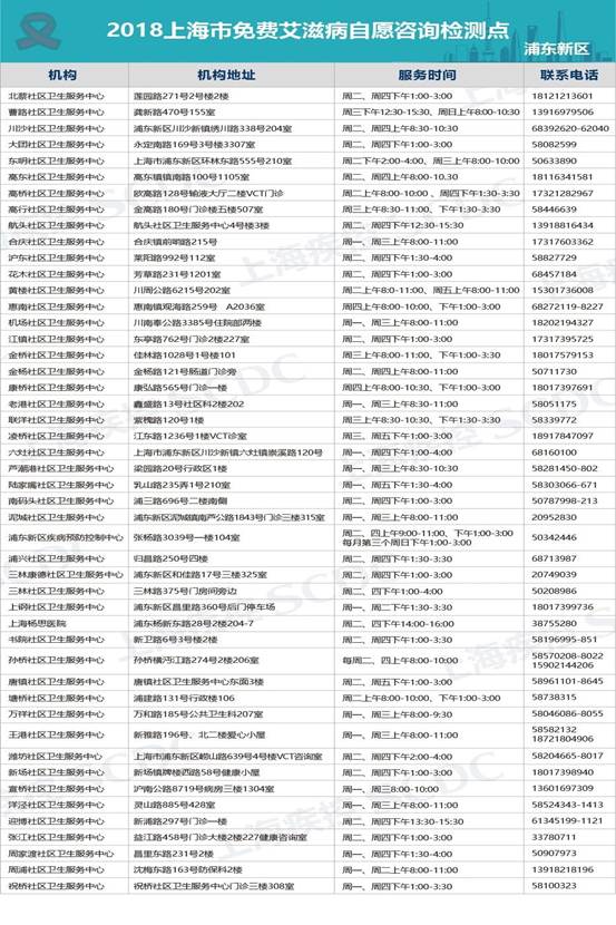 注意:下表为浦东新区常规服务时间。12月艾滋病检测月期间,各检测点每天(或每个工作日)都开展咨询和检测活动。