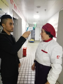 在宿舍园区、学生食堂,配备体温枪,每位后勤职工上岗前都必须依次接受体温检测,发现异常做好记录,并及时送医就诊。