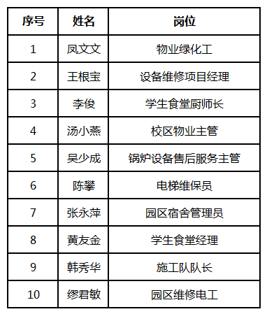 为不断深化“三全育人”综合改革,大力选树先进典型模范,通过服务工作传递正能量,引导广大后勤员工将育人理念全面融入本职岗位建设中,学校于2020年6月开展了上海中医药大学后勤“服务育人明星”评选活动,经广泛征求意见、民主推荐,共有22位优秀员工入围候选人,经事迹宣传充分展示了上中医后勤人的良好风采和精神风貌。在网络投票环节中,共有4646位师生员工参与,结合师生网络票选结果及评委组评审意见,最终推选了10位员工获评2020年上海中医药大学后勤“服务育人明星”称号,名单如下(按姓氏笔画排序):