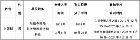 经支部委员会研究,报上级党委备案同意,将卜国桢同志列为发展对象(名单见附表)。为进一步增强发展党员工作的透明度,确保发展新党员的质量,根据《中国共产党章程》和《中国共产党发展党员工作细则》,现将发展对象的基本情况予以公示。