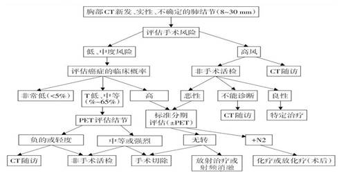 胸部CT随访观察,评估手术风险,制定继续胸部影像随访、非手术活检、手术切除、放疗或化疗等治疗方案。