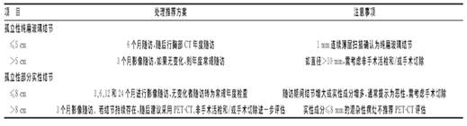 根据孤立性纯磨玻璃结节和孤立性部分实性结节的大小,胸部CT随访、非手术活检、手术切除进一步评估等治疗方案。