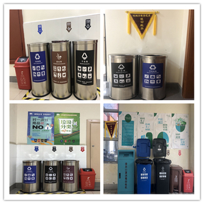 在校区公共区域,配备四分类、三分类、二分类垃圾投放容器。在室内休闲区、茶水间配备湿垃圾投放容器。此外,每栋楼都设有一个集中分类投放点,包括可回收物、干垃圾、湿垃圾、有害垃圾收集容器。