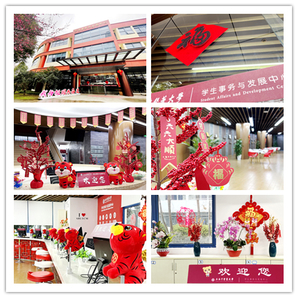 学生事务与发展中心是一站式“开放、共享、自主”的学生服务平台,这里留下了同学们过去一年努力学习、青春奋斗的身影。往日熟悉的铜柱点缀着“红色”福字贴画,曾经热闹的柜台列队着俏皮的“红色”福虎,以往的接待区展陈着浓艳的“红色”年花。听说1月31日,这里还会举行热闹非凡的“新春游园会”,期待大家一起乐乐乐,闹闹闹,虎虎生威把年闹。