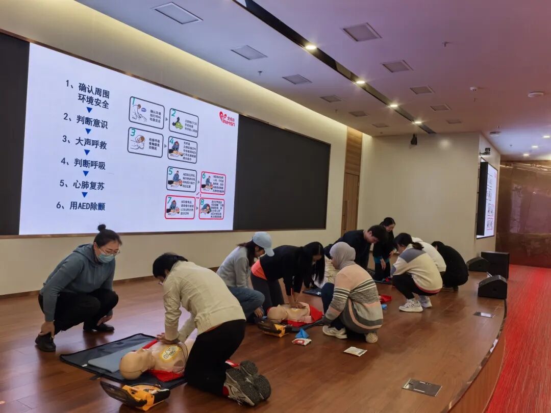 实操环节中,在授课老师的细心指导下,大家完成了各个步骤的学习,并分组演练了心肺复苏、AED体外除颤仪的使用等救护技能,确保流程熟记于心、操作标准无误。